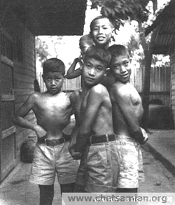 นักเพาะกาย โชว์กล้ามกันที่หลังบ้านกำนันโกวิท วงศ์ยะรา จากซ้ายโอฬาร ลักษิตานนท์,นายแก้ว,สาธร วงษ์วานิช, ข้างบนอโนทัย ไทยสวัสดิ์ เห็นหน้านิดหน่อยนั้น รังสฤษดิ์ ลักษิตานนท์